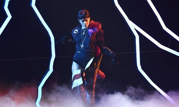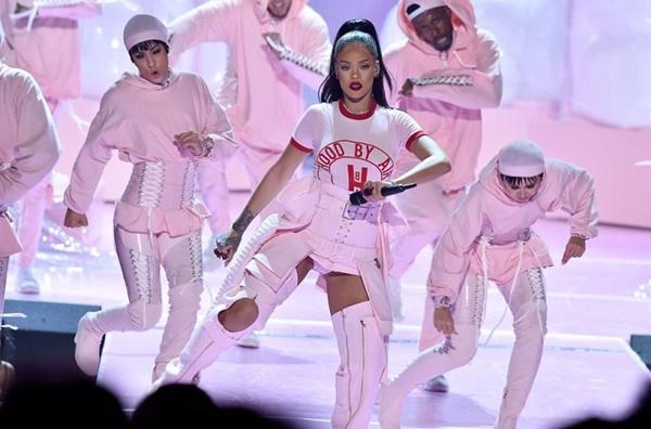 Trong một diễn biến khác, Rihanna cũng năng suất không kém đàn chị Beyoncé khi đem đến rất nhiều hit đỉnh. Tuy nhiên chủ nhân hit Work lại “thoắt ẩn thoắt hiện” trong suốt thời gian diễn ra chương trình: Mở màn với liên khúc Please Don’t Stop the Music, Only Girl In The World, We Found Love Where Have You Been; tiếp tục xuất hiện với Work sau sân khấu của Kanye West; tái xuất lần thứ ba với Needed Me, Bitch Better Have My Money và thêm một lần nữa oanh tạc sân khấu với Stay, Diamonds. Không thể đếm xuể số ca khúc mà Riri trình diễn đêm nay!