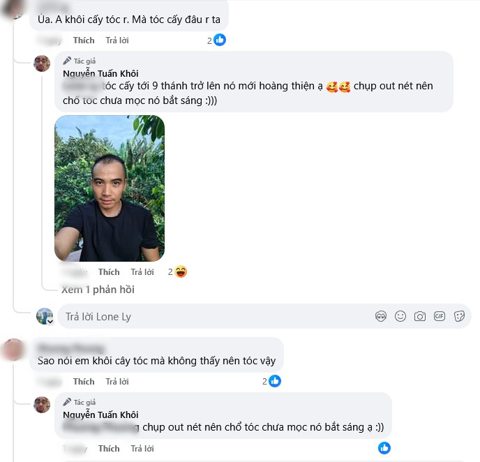 Dưới bài đăng, một số người để lại bình luận: "Ủa, anh Khôi cấy tóc rồi mà tóc cấy đâu rồi ta?" hay "Sao nói em Khôi cấy tóc mà không thấy tóc đâu vậy".