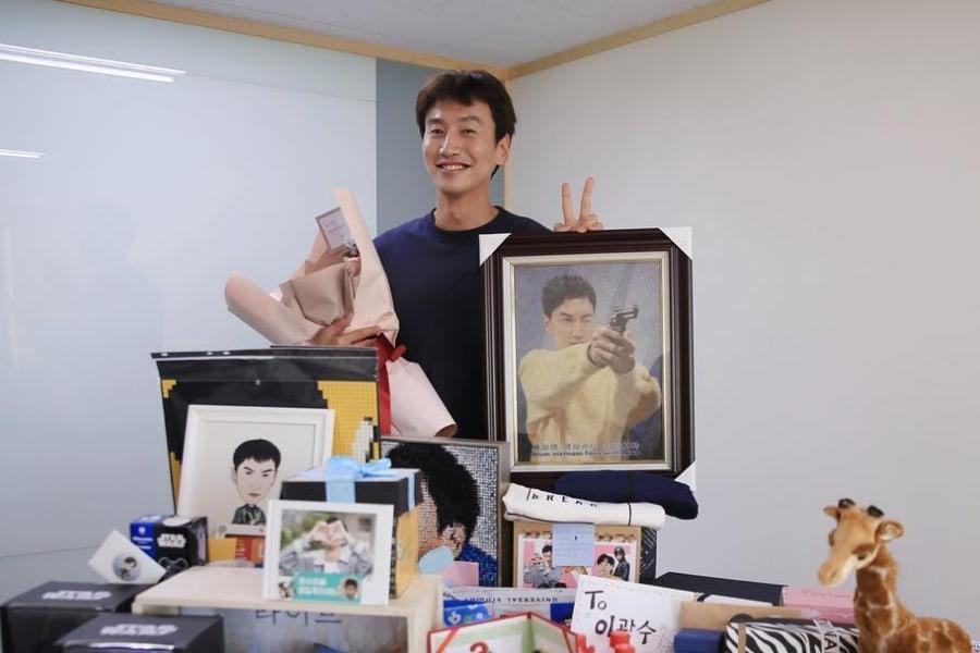 Lee Kwang Soo chia sẻ hình ảnh quà tặng của người hâm mộ trên Instagram trong ngày sinh nhật. Bức ảnh cho thấy ngôi sao "Running Man" mỉm cười hạnh phúc với xung quanh là bánh sinh nhật, chân dung vẽ tay, nhân vật Star Wars và một con hươu cao cổ nhồi bông