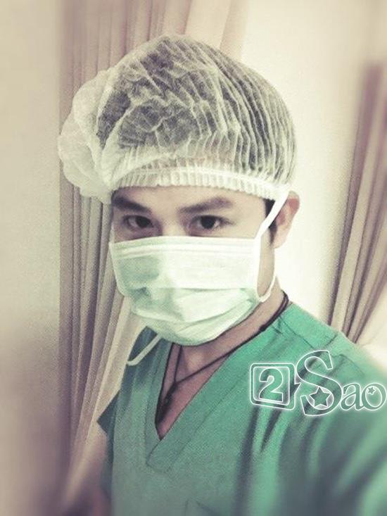 Trong phòng hộ sinh, nhạc sỹ Nguyễn Văn Chung trang bị quần áo khử vi trùng, bịt kín khuôn mặt và chỉ để lộ ra đôi mắt to tròn và anh cho biết, anh được các cô y tá khen là rất đẹp trai.