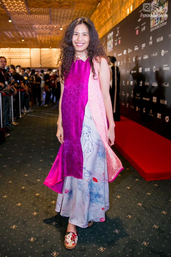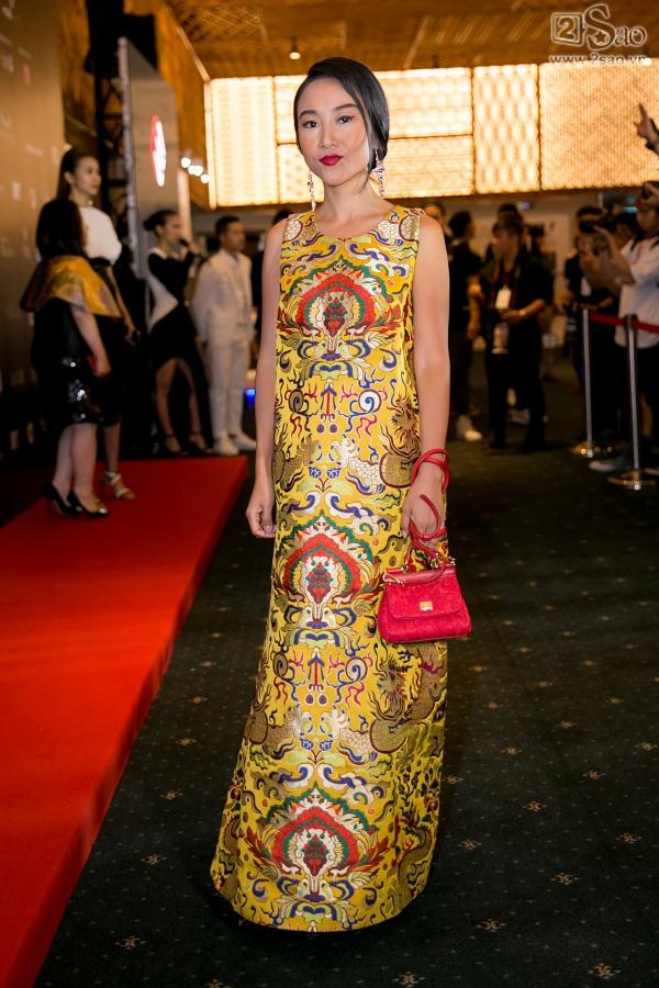 Chiếc váy với hoạ tiết log phượng màu vàng rất hợp với làn da nâu của Đoan Trang,
