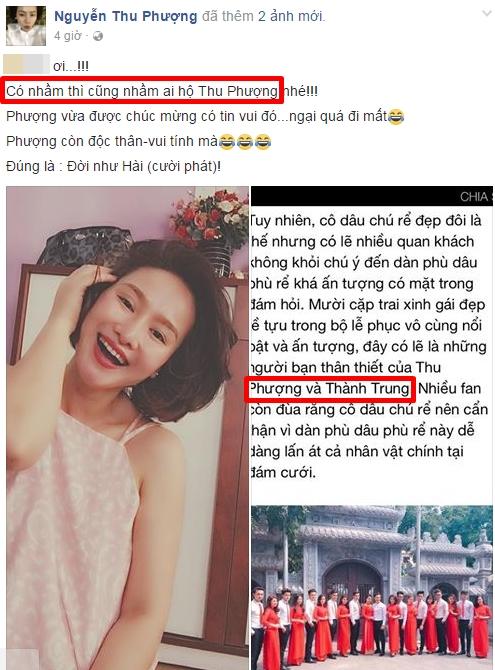 Sở dĩ Thu Phượng phải lên tiếng đính chính bởi mới đây, một bài báo đưa tin Thành Trung đính hôn nhưng vì sơ suất, phần tên cô dâu lại là Thu Phượng. "Mười cặp trai xinh gái đẹp tề tựu trong bộ lễ phục vô cùng nổi bật và ấn tượng. Đây có lẽ là những người bạn thân thiết của Thu Phượng và Thành Trung", đoạn chú thích ảnh cho biết. Cũng vì sự nhầm lẫn này mà Thu Phượng sau đó phải mất khá nhiều thời gian giải thích với bạn bè, những người đùa vui cô "được cưới lại lần nữa".
