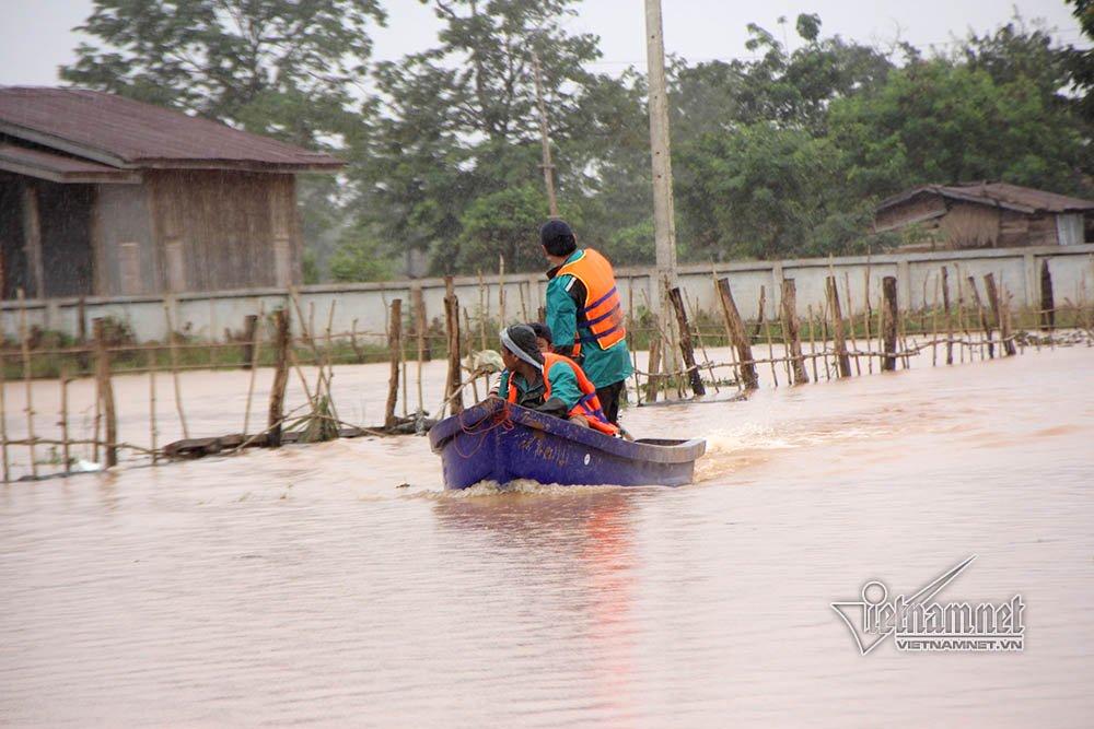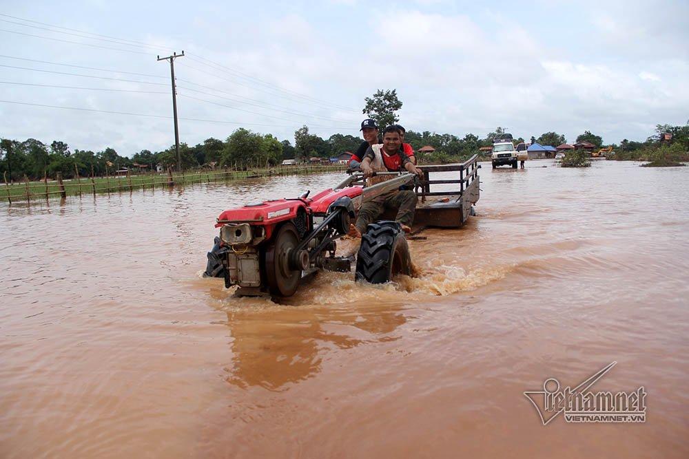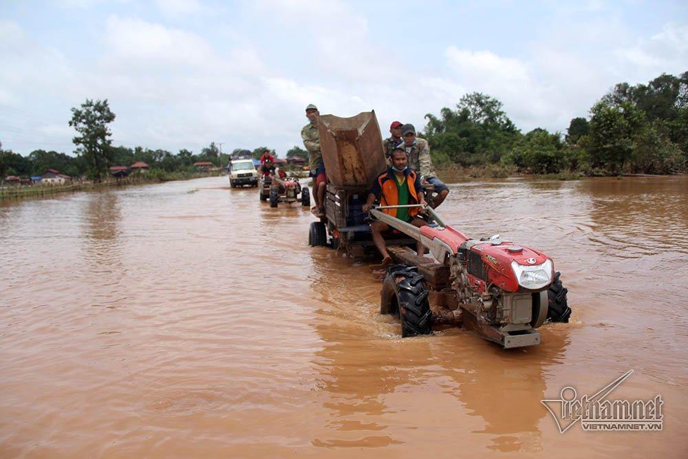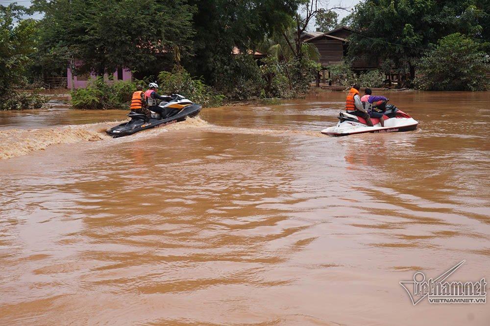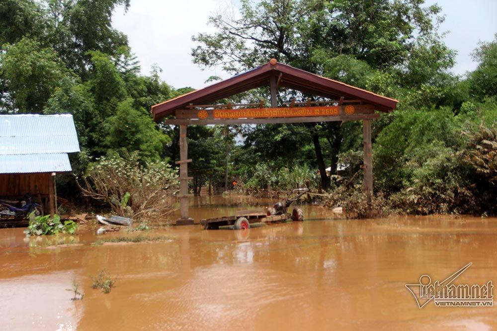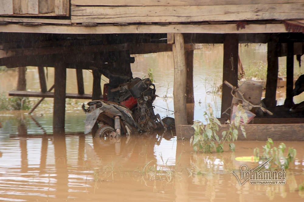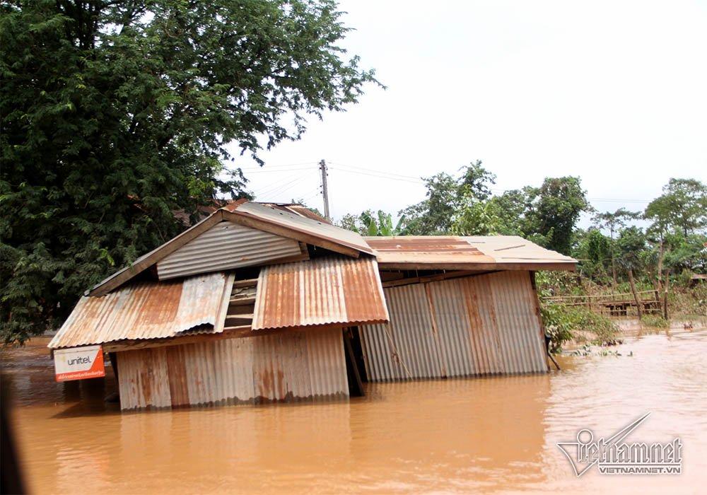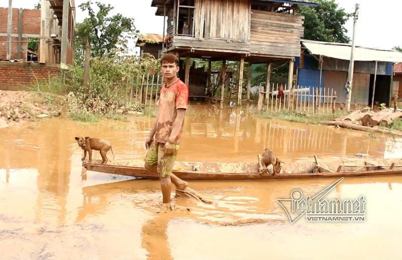 Bản Hồ Coong, huyện Sadamxay (tỉnh Attapeu, Lào) nằm dưới hạ lưu của đập thủy điện bị vỡ, sau 3 ngày nước trộn bùn quánh vẫn mênh mông, phương tiện đi lại duy nhất là xuồng.