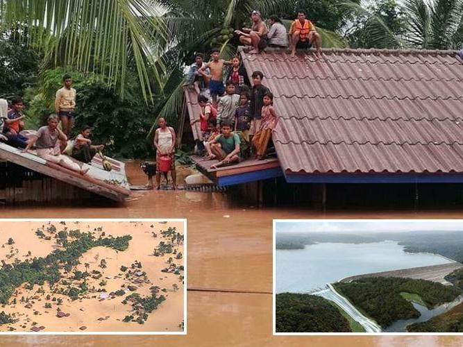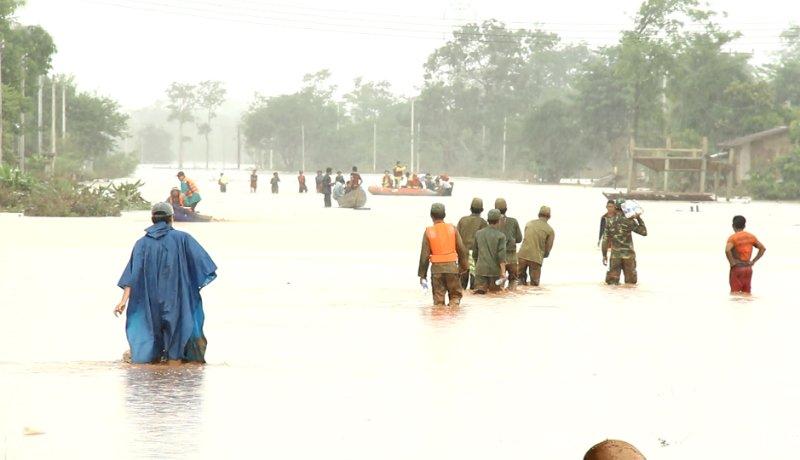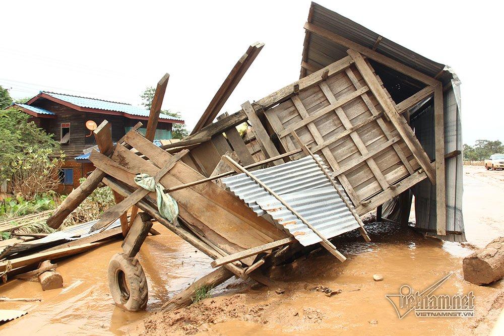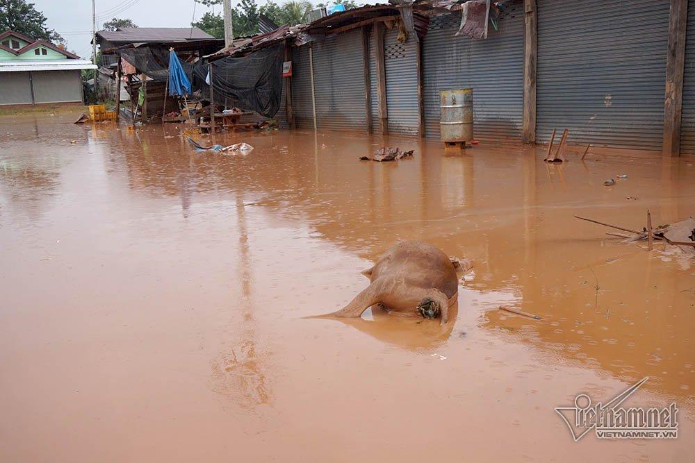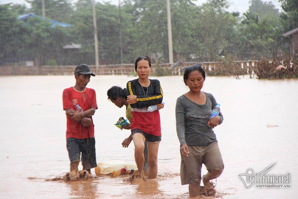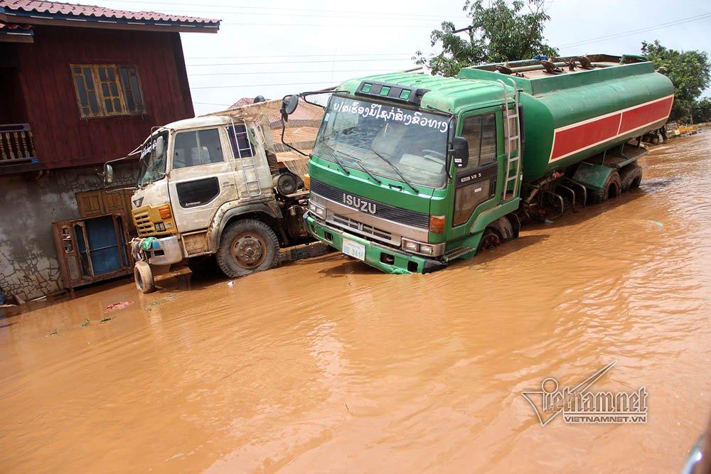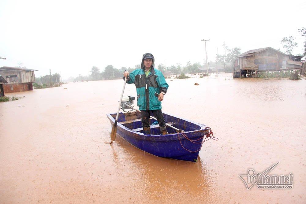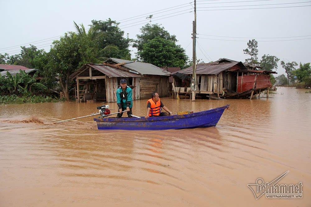 Bản Hồ Coong, huyện Sadamxay (tỉnh Attapeu, Lào) nằm dưới hạ lưu của đập thủy điện bị vỡ, sau 3 ngày nước trộn bùn quánh vẫn mênh mông, phương tiện đi lại duy nhất là xuồng.