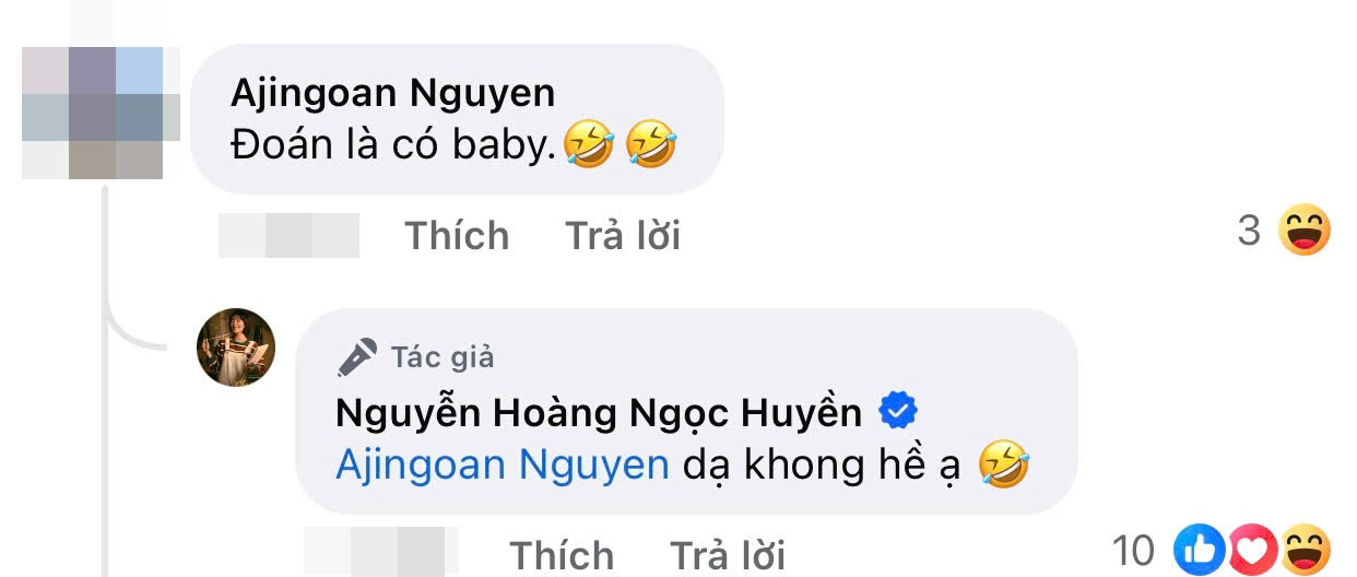 Theo đó, dưới bài đăng công bố tin vui của Ngọc Huyền trên trang cá nhân, một netizen đã vào hỏi thẳng: "Đoán là có baby".