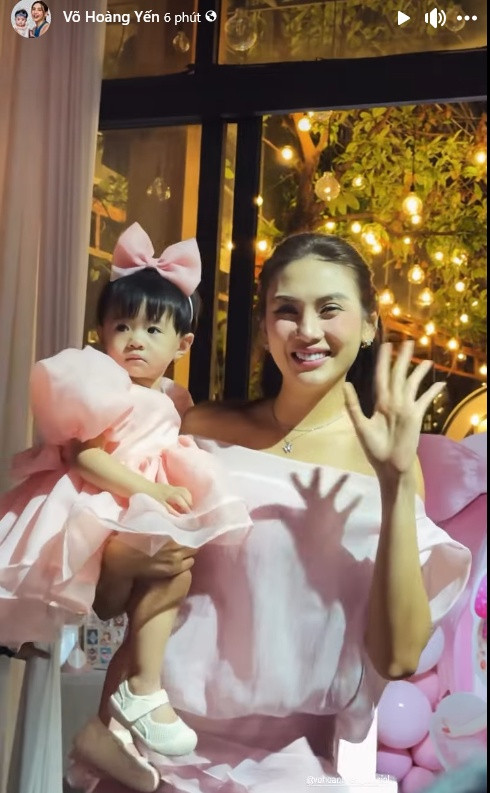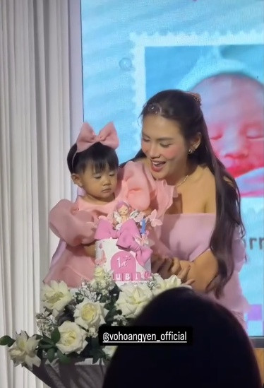 Tiệc sinh nhật con gái siêu mẫu được trang trí với tông màu hồng chủ đạo. Võ Hoàng Yến và Nubi diện trang phục màu hồng ngọt ngào. Trong khi con gái diện đầm hóa thân thành tiểu công chúa thì Võ Hoàng Yến phô diễn được đôi chân dài thẳng tắp như kiếm Nhật.