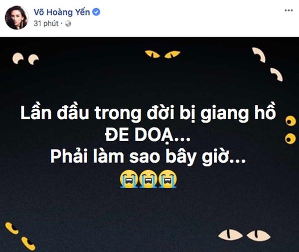 Trong lúc Võ Hoàng Yến cùng trợ lý đang tìm cách tháo gỡ hiểu lầm giữa 2 bên thì cô bất ngờ nhận được tin nhắn đe dọa có nội dung liên quan đến tính mạng “… Chị là nghệ sĩ, tự dưng 1 ngày chị đang đi đánh nhạc hay đi diễn mà bị làm sao thì cũng không ai biết được đâu…”.