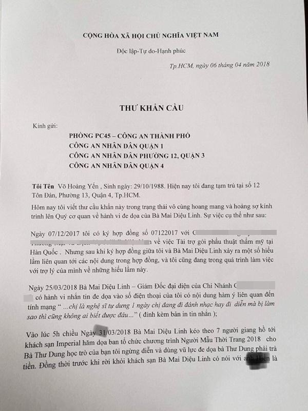 Được biết, Võ Hoàng Yến đã phải lên công an yêu cầu giúp đỡ. Theo lá thư cầu cứu của siêu mẫu, người đe dọa cô là Á khôi Mai Diệu Linh- người đang giữ vị trí giám đốc của một công ty chuyên về thẩm mỹ. Theo lời Hoàng Yến, cô và người này từng ký kết hợp đồng quảng bá hình ảnh, tuy nhiên trong quá trình làm việc, cả 2 phát sinh căng thẳng dẫn đến mâu thuẫn không thể giải quyết.