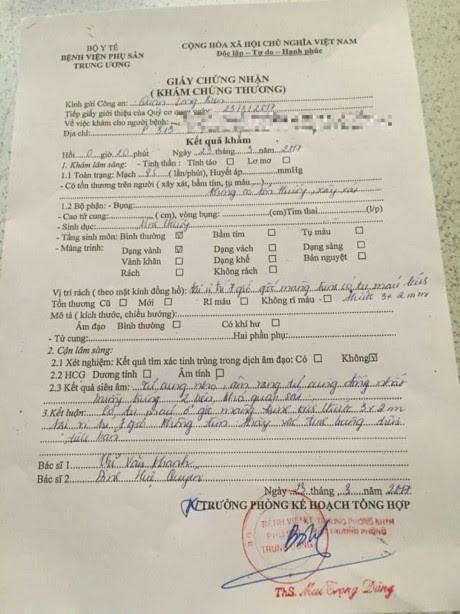 Trước đó, khi tiếp nhận đơn trình báo và xác minh sơ bộ, tối ngày 22/3, Cơ quan CSĐT đã đưa cháu bé đến bệnh viện Phụ sản trung ương khám. Đến 16h ngày 23-3, bệnh viện đã có kết luận về tổn thương của bé. Theo đó, bệnh viện xác định, bé không có tổn thương, xây xát trên người; bộ phận sinh dục bình thường, tầng sinh môn bình thường, màng trinh dạng vành, tại vị trí 7 giờ gốc màng trinh có tụ máu kích thước 3x2mm, kết quả siêu âm thấy tử cung nhỏ âm vang tử cung đồng nhất, buồng trứng hai bên khó quan sát; không tìm thấy xác tinh trùng trên tiêu bản.