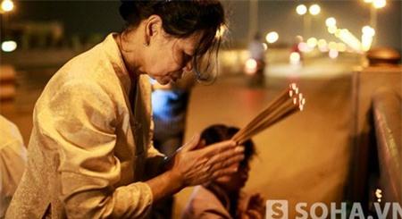 Bà Nguyễn Thị Hiền thắp hương bên cầu Thanh Trì nơi con gái bị ném xác xuống sông Hồng.