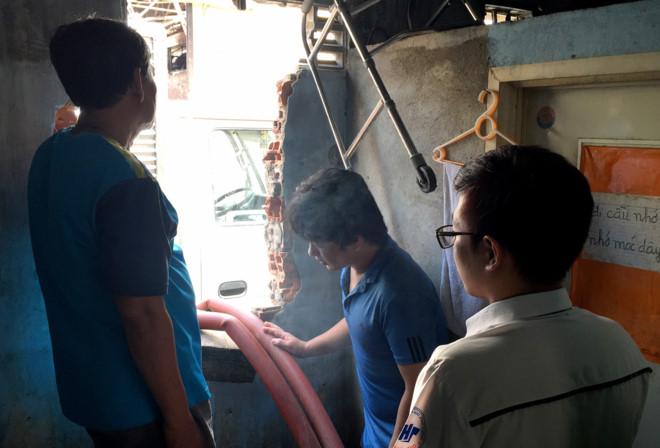 Tường nhà dân bị đập để thông vòi chữa cháy. Ảnh: Lê Trai.