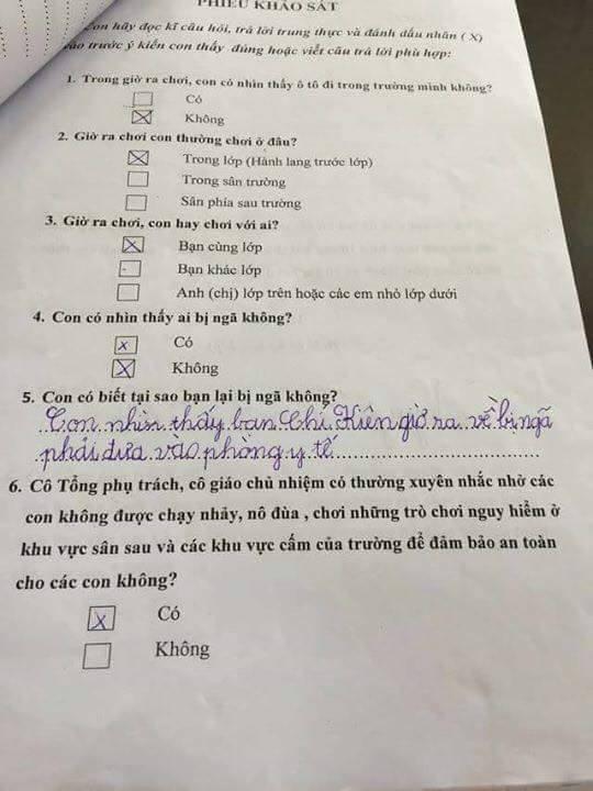 “Khi lấy phiếu khảo sát tới từng lớp thì BGH trường thông báo là làm phiếu khảo sát phục vụ cho công tác thanh tra an toàn trường học vào tháng 3 của phòng chứ giáo viên, học sinh cũng không rõ là khảo sát về vụ việc cháu Kiên” – cô Tú cho biết.