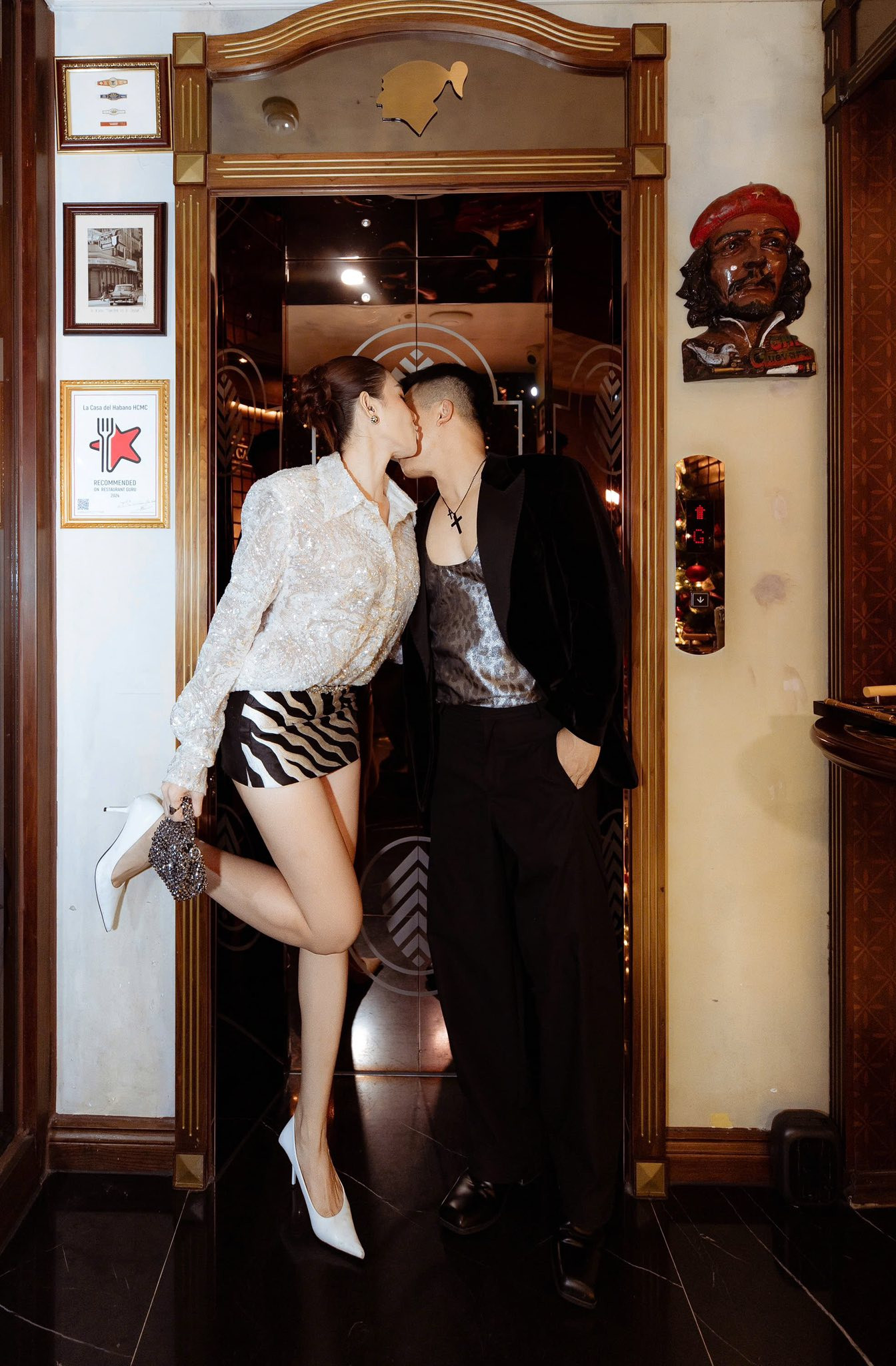 Xuất hiện ở bữa tiệc, ông bầu sinh năm 1983 lên đồ phóng khoáng với set suit phối cùng áo da beo. Trong khi đó, Lê Hà khoe trọn đôi chân dài thẳng tắp với áo sơ mi lấp lánh mix cùng chân váy mini.