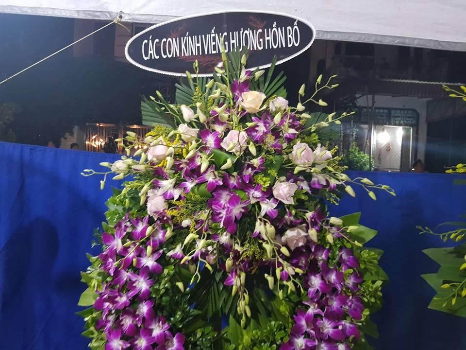 Nổi bật lên trong những lẵng hoa tiễn đưa của các tổ chức, đơn vị và bạn bè là vòng hoa màu tím buồn ghi tên các con đưa tiễn bố. Dòng chữ trên lẵng hoa tươi để ngay cổng vào như xoáy vào lòng người ở lại.