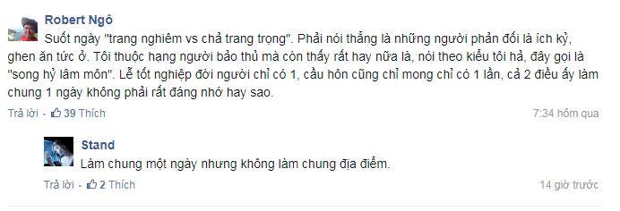 Thành viên Robert Ngô tự nhận mình là người bảo thủ, song cũng không thấy màn cầu hôn này đáng lên án, thậm chí còn rất hay, là "song hỷ lâm môn".