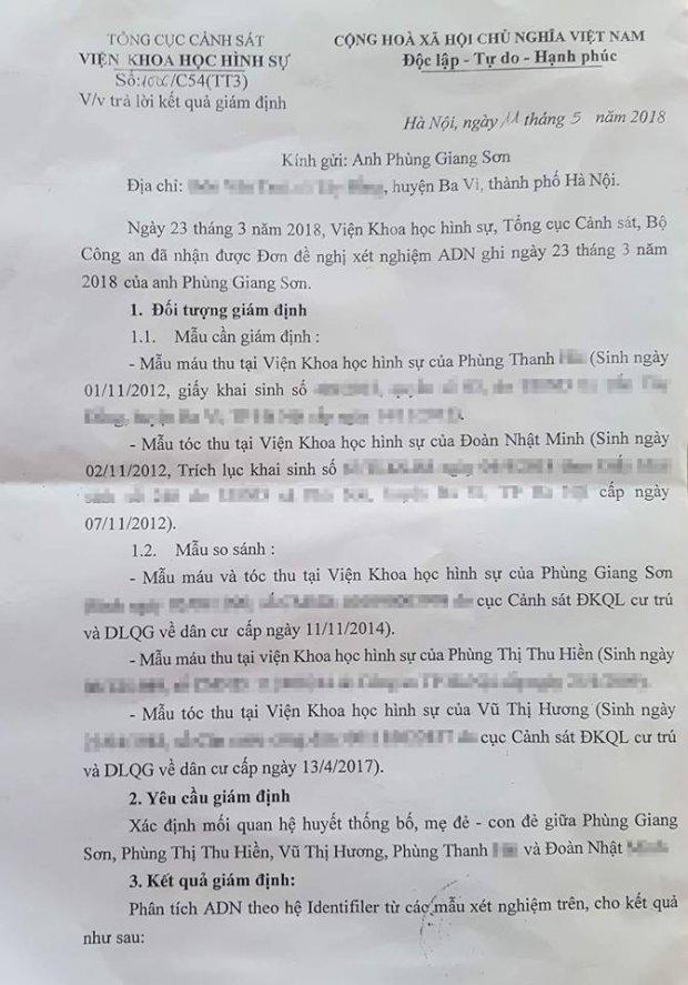 Qua nói chuyện thì được biết, chị Hương cũng sinh cùng ngày với vợ anh Sơn, chỉ trước đó có vài phút. Nghi ngờ hai đứa trẻ sinh ngày 1/11/2012 bị trao nhầm, anh Sơn đã lấy mẫu tóc đi xét nghiệm, kết quả cho thấy 99,9% cháu bé mà chị Hương đang chăm sóc có cùng huyết thống với vợ chồng anh.