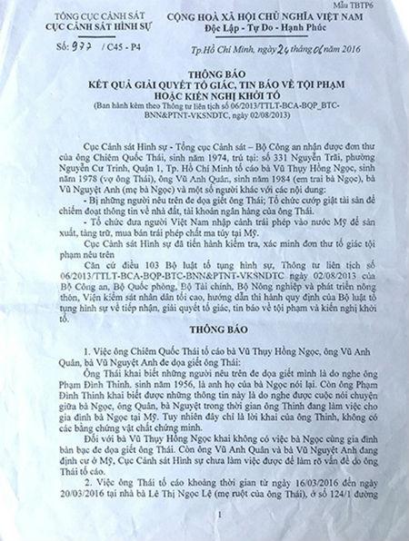Từ cơ sở này, ông Thái đã tố cáo bà Ngọc cùng mẹ ruột, em trai của bà Ngọc đến Cục Cảnh sát hình sự - Bộ Công an. Sau đó, cơ quan công an có mời ông Thịnh lên làm việc.