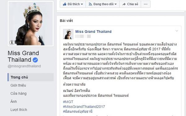Fanpage chính thức của Miss Grand Thailand chia sẻ về việc người đẹp qua đời.