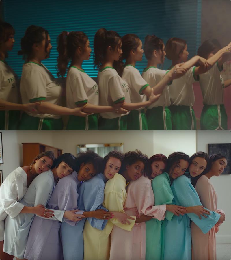 Một đoạn clip tổng hợp đã được thực hiện để chỉ ra những phân cảnh giống nhau giữa 2 MV: nữ chính nằm trên giường, bối cảnh MV được thực hiện trong một căn phòng, bạn bè tới trò chuyện giải sầu cùng nữ chính, cảnh quay tập thể khi chụp ảnh, đứng nối hàng.