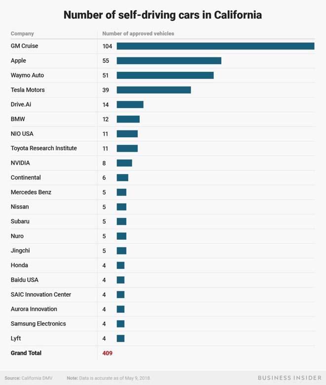 Trước đó vào tháng 1/2018, số phương tiện đăng ký thử nghiệm công nghệ tự lái của Apple chỉ mới là 27. Ông lớn của thung lũng Silicon mới được cấp phép về việc thử nghiệm công nghệ tự lái từ tháng 4/2017 với 3 mẫu Lexus Rx450h. Hiện DMW cho biết đã có tổng cộng 51 công ty đăng ký 409 mẫu ô tô thử nghiệm tự lái trên toàn Hoa Kỳ.