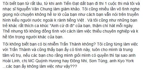 Các em bảo ban đầu chị ấy nói kẹt lịch chỉ quay đc lúc 2h chiều, chiều nay không biết thế nào chị lại nổi hứng bảo chỉ quay đc chung game với anh Trấn Thành lúc 6:pm, nếu k có anh Thành chị không quay mà gấp quá tụi em không biết làm sao đành kêu cứu chị. Tôi thương các em nhưng rất bực vì từ ngày vô nghề đến nay chưa bao giờ gặp trường hợp này vả lại tính tôi nếu giúp đc thì cũng phải đúng việc tôi mới giúp. Tôi cần có sự tôn trọng!!! Mà lại không phải quay giờ cũ là 6:pm mà phải lên quay từ lúc 2:pm, giờ tôi đi chụp bìa báo.