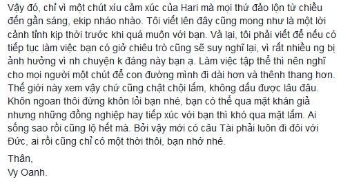 Dòng trạng thái rất dài trên facebook cá nhân của Vy Oanh kể khá chi tiết về 'bệnh ngôi sao' của Hari Won: