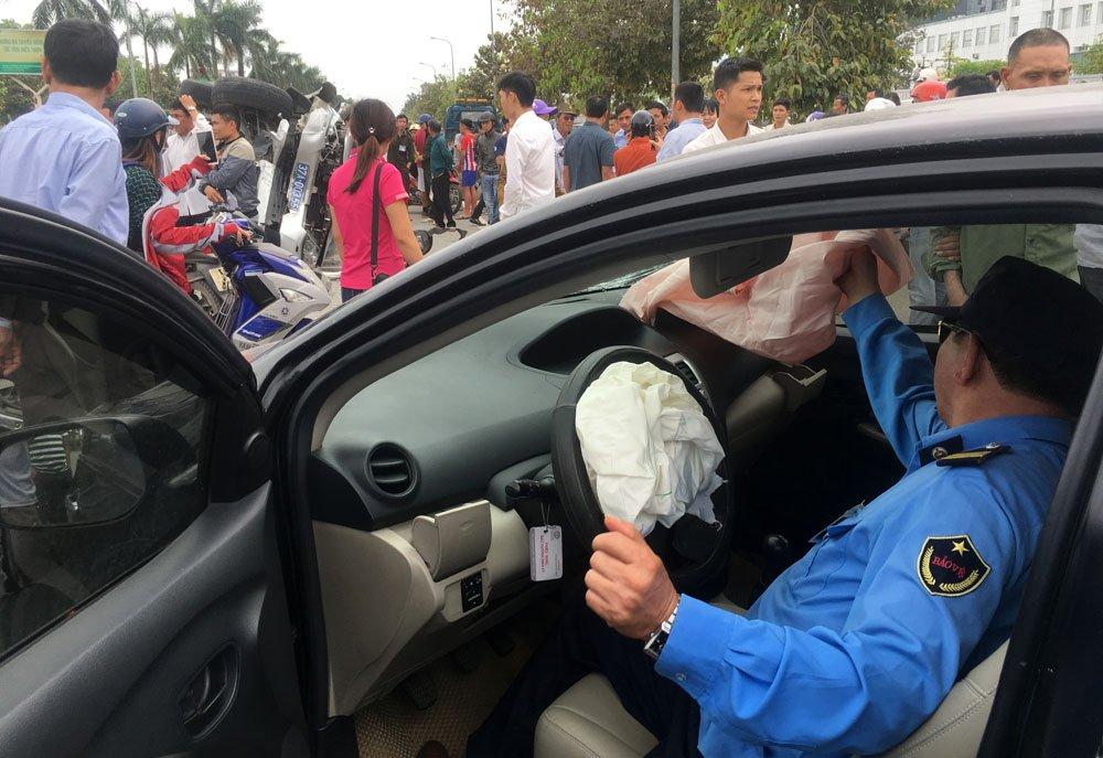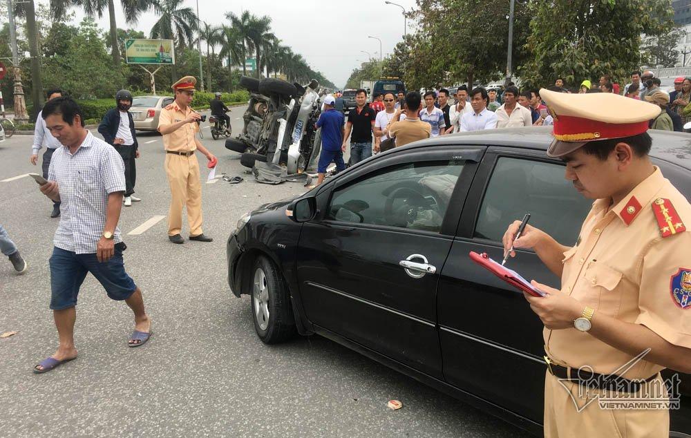 Cả hai xe bị xoay nhiều vòng, riêng chiếc xe biển xanh bị lật nghiêng giữa đường. Túi khí của 2 xe đều bung ra, kính vỡ bung rơi giữa đường.
