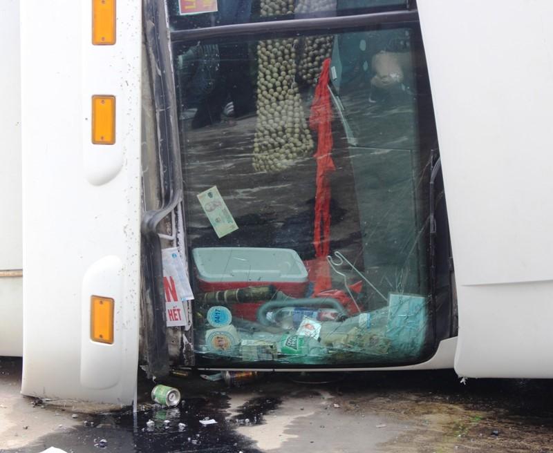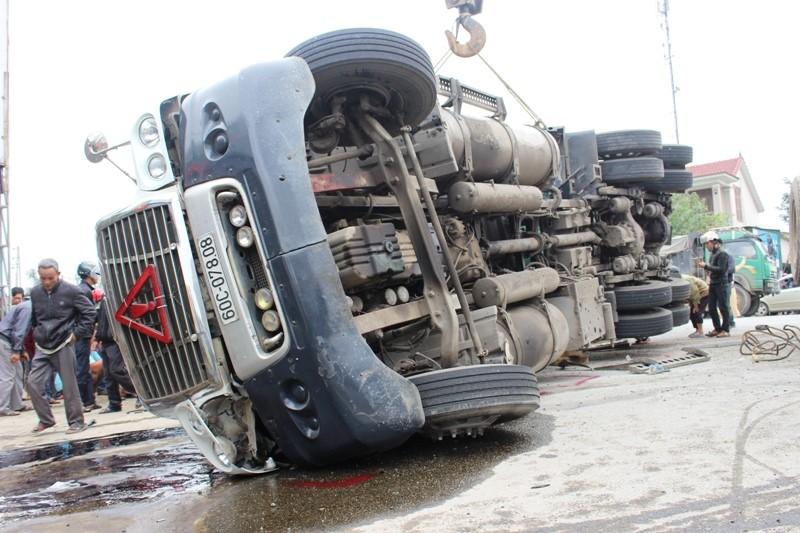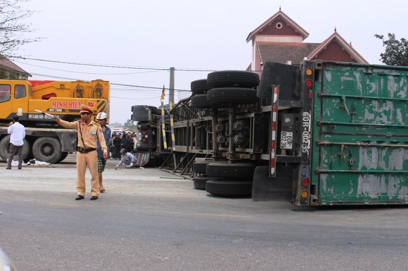 Tại hiện trường, chiếc xe container bị lật nghiêng, chắn ngang đường ngược chiều, vỡ phần đầu, chiếc xe máy bị văng xa gần 10 m. Phần đầu xe container vỡ, móp. Dầu chảy khắp mặt đường.