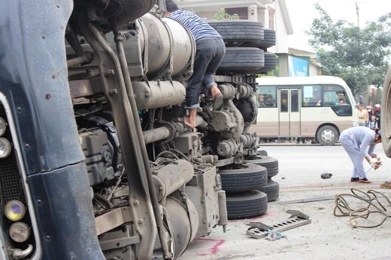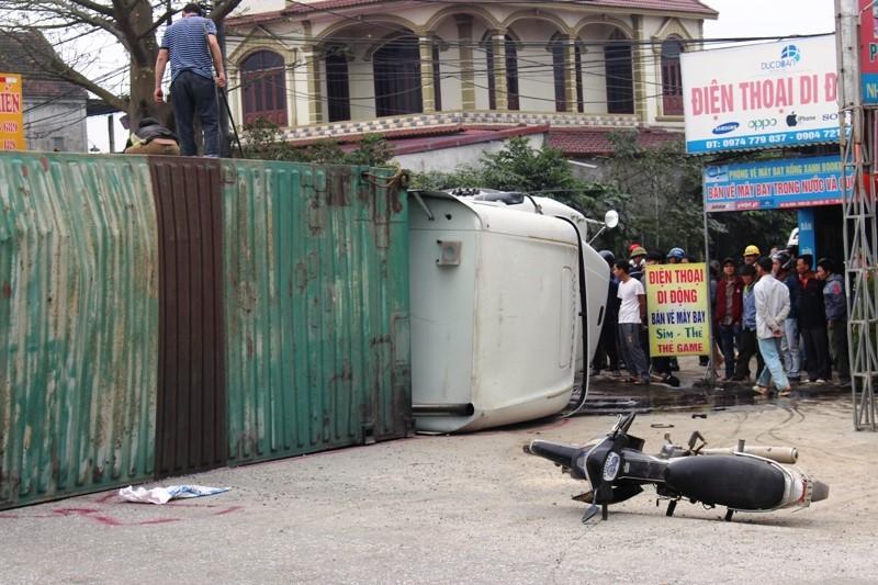 Cú tông mạnh khiến chiếc xe container mất lái, lật nghiêng, thùng xe đè lên người đàn ông đi xe máy khiến người này tử vong tại chỗ. Tài xế xe container bị thương nhẹ.