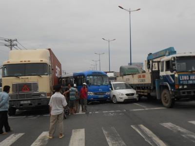 Tại hiện trường, theo ghi nhận của PV Dân trí, các phương tiện bị nạn nằm chắn hết mặt đường để chờ giải quyết khiến giao thông hướng cửa ngõ vào thành phố bị ùn tắc nghiêm trọng. Lực lượng CSGT đội Rạch Chiếc đã kịp thời có mặt đánh dấu hiện trường và di dời một số xe vào trong để giải tỏa, điều tiết giao thông.