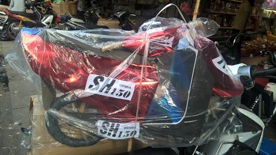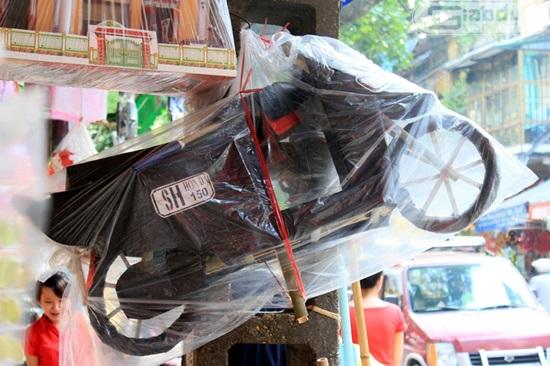 Một chiếc xe SH với kích cỡ như thật, được bán với giá 500.000 đồng. Nhiều chủ quán bán hàng mã cho biết, loại hàng mã có kích cỡ lớn như ngựa, xe ô tô, xe máy có kích cỡ như thật phải được đặt trước, chỉ một số ít được trưng bày.