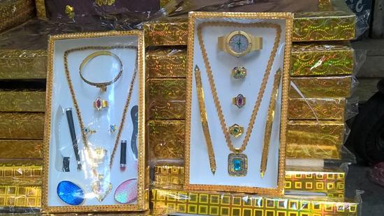 Vàng, kim cương, dây truyền vàng cũng thiết kế rất đẹp. Theo chủ quán, "mặt hàng sang chảnh" này lại có giá rất rẻ 80.000 đồng/bộ