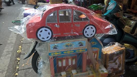 Năm nay, xe ô tô 4 chỗ được bán khá nhiều với đủ kích cỡ. Theo người bán, những mặt hàng này được nhập ở các tỉnh làm vàng mã lớn như Bắc Ninh, Vĩnh Phúc và 1 số huyện ngoại thành Hà Nội từ trước đó cả tháng.