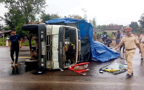 Sau khi va quệt với ôtô khách, xe tải lật nghiêng trên quốc lộ 1 đoạn qua thị trấn Phù Mỹ (huyện Phù Mỹ). Ảnh: V.Tố.