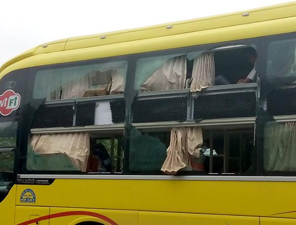 Sau cú va quẹt mạnh, nhiều mảng kính phía bên trái ôtô khách giường nằm vỡ nát trống hoác, hơn 20 hành khách hoảng hốt chen nhau thoát thân.