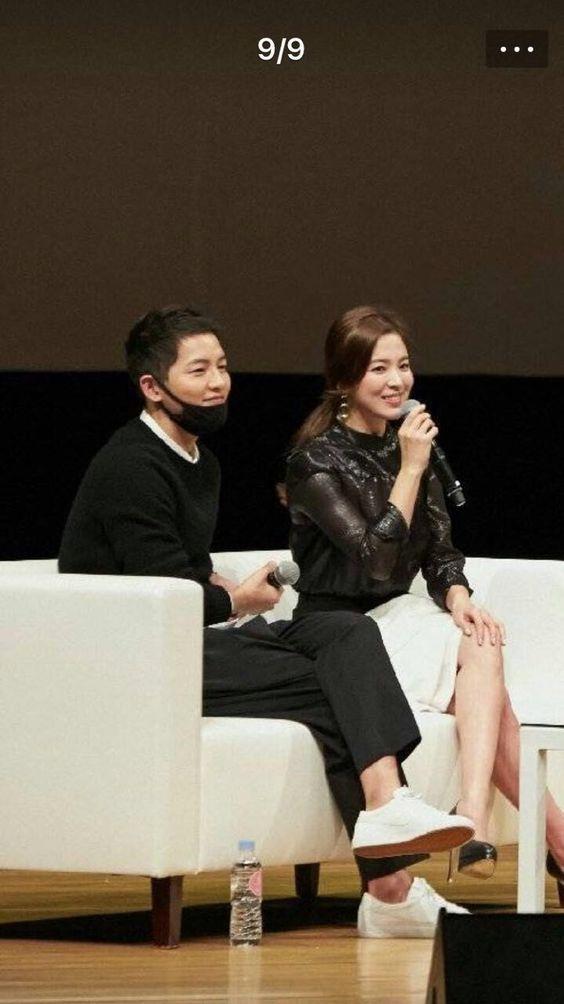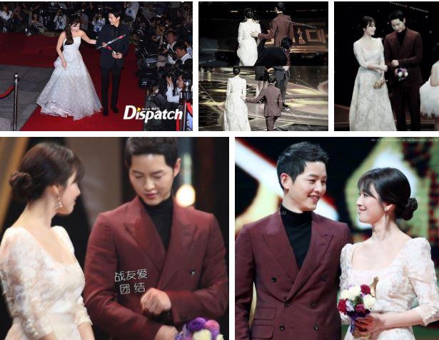 Cả hai cùng chọn trang phục màu đen, Song Hye Kyo nữ tính nhẹ nhàng trong một bộ váy đen cổ V sâu hút mắt thì Song Joong Ki lịch lãm với bộ vest đen đơn giản.
