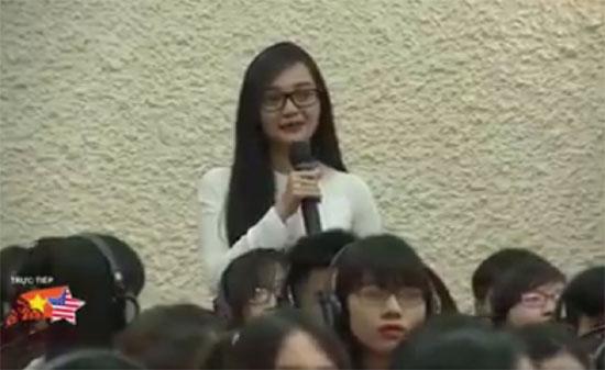 "Xin chào Ngài. Tôi tên là Linh, hiện là sinh viên năm thứ ba, Khoa Ngôn ngữ học. Cảm ơn ngài đã có bài phát biểu và tôi tự hỏi liệu Ngài có cho phép tôi hỏi một câu hỏi. Liệu Hoa Kỳ có tiếp tục duy trì chính sách can dự của mình với khu vực Châu Á-Thái Bình Dương hay không? Xin cảm ơn", Trần Mỹ Linh đặt câu hỏi.