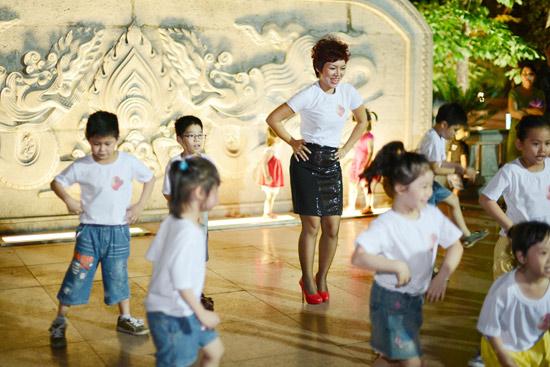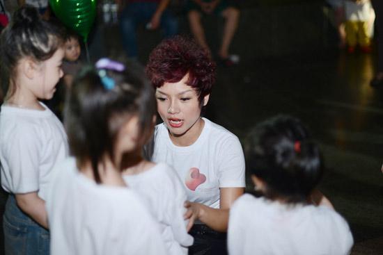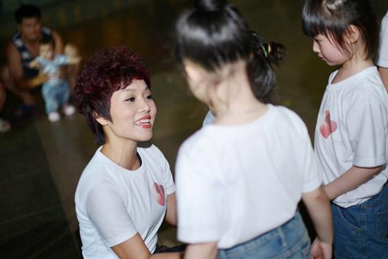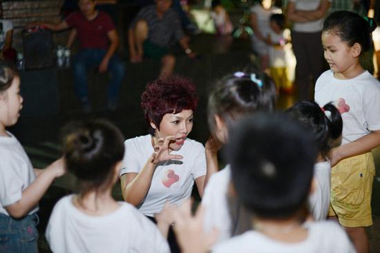 Ca sĩ Thái Thùy Linh ngoài tài kể chuyện, chị còn hướng dẫn các em nhỏ các động tác biểu diễn