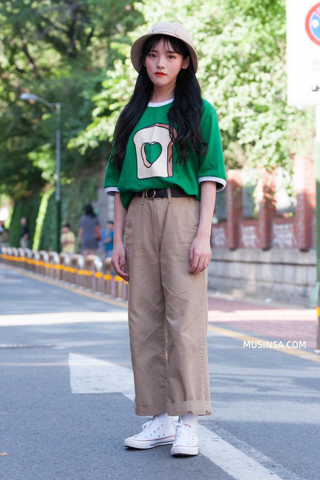 Cũng diện áo phông họa tiết nhưng cô bạn này lại có một phép thử vô cùng mới mẻ với quần khaki và mũ vải mềm. Kết quả nhận được xinh xắn, nổi bật hơn cả mong đợi.