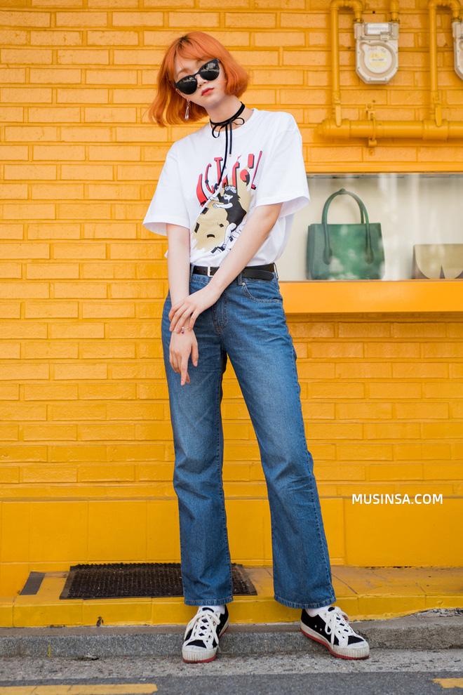 Đừng nghĩ rằng mình chỉ có thể diện áo phông với quần jeans bởi các loại quần tây ống đứng, ống loe cũng cực kỳ đạt tiêu chuẩn đấy. Cô bạn này đã mix áo phông họa tiết với quần ống loe cùng giày sneaker và đã có một set đồ thật bắt mắt, khỏe khoắn nhưng vẫn không thiếu thanh lịch và hiện đại.