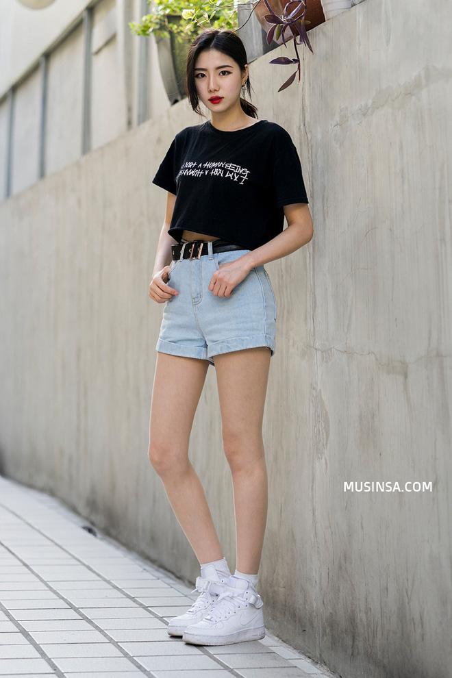 Combo chống nóng hiệu quả và lại còn tôn dáng triệt để cho các nàng ngày hè: crop top + jean shorts + giày sneaker trắng.