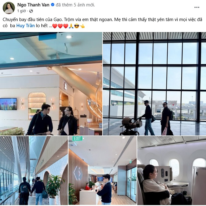 Cô viết: "Chuyến bay đầu tiên của Gạo. Trộm vía em thật ngoan. Mẹ thì cảm thấy thật yên tâm vì mọi việc đã có ba Huy Trần lo hết."