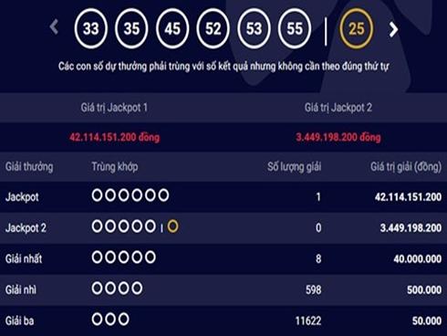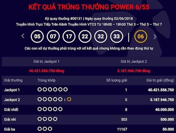 Tại kỳ quay 131 của sản phẩm Power 6/55, Công ty Xổ số điện toán Việt Nam - Vietlott đã tìm ra một tấm vé trúng jackpot 1, trị giá hơn 40 tỉ đồng. Như vậy, đây là tấm vé thứ ba trúng jackpot 1 của sản phẩm Power 6/55 chỉ trong vòng chưa đầy 1 tháng.