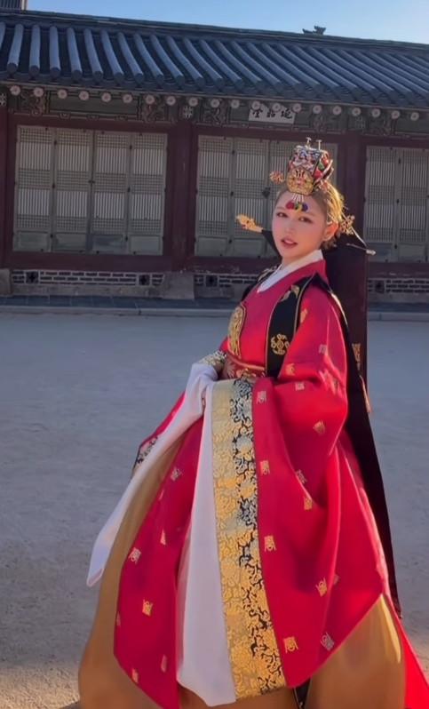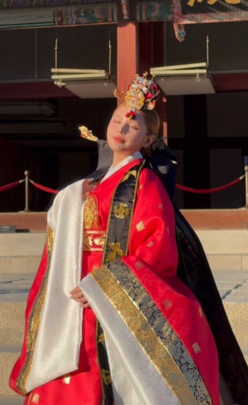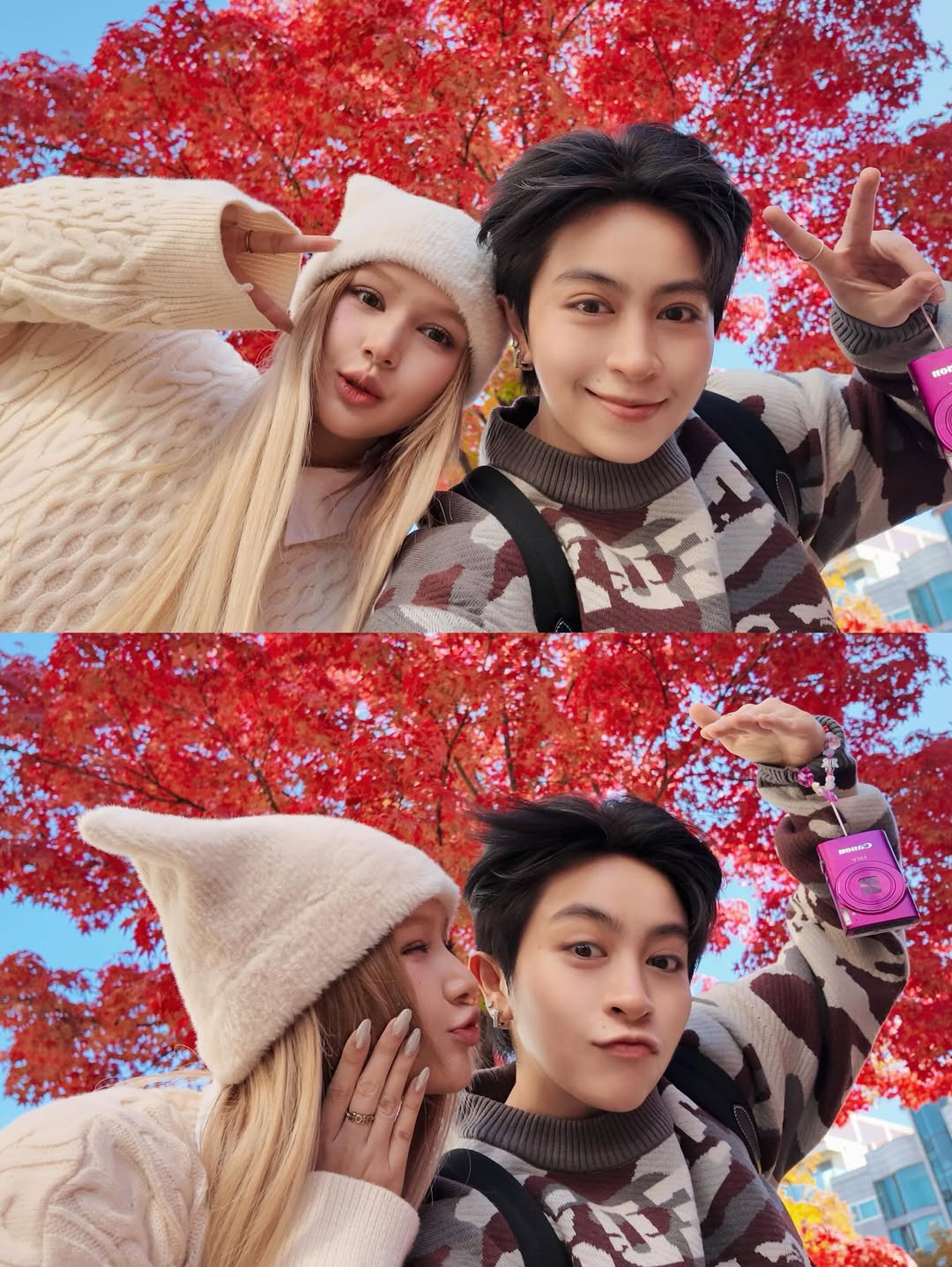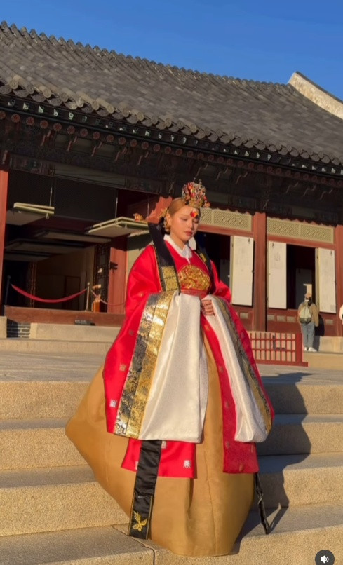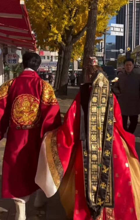 Một trong những trải nghiệm không thể thiếu khi đi Hàn Quốc chính là diện trang phục truyền thống chụp hình ở cung. Theo đó, cặp đôi diện trang phục Hanbok với tông màu đỏ rực rỡ. Cả hai thoải mái thể hiện tình cảm trên đường phố, giữa khung cảnh lá vàng cực kì lãng mạn.