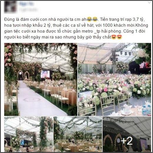 Mới đây, cư dân mạng Việt Nam lại tiếp tục xôn xao với rạp trang trí hơn 5 tỷ đồng của con đại gia tới từ Hải Phòng. Theo đó, tài khoản facebook có tên N.V đăng tải hình ảnh trong đám cưới cùng dòng trạng thái: "Đúng là đám cưới con nhà người ta. Tiền trang trí rạp 3,7 tỷ; hoa tươi nhập khẩu 2 tỷ, thuê các ca sĩ về hát với hơn 1.200 khách mời. Không gian tiệc cưới xa hoa được tổ chức ở Hải Phòng".