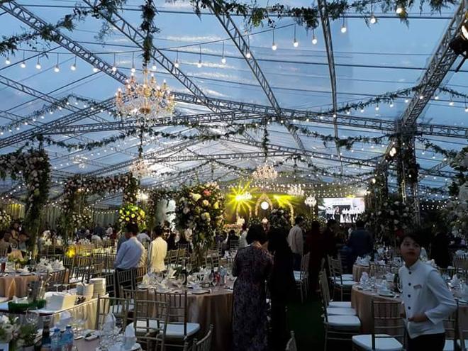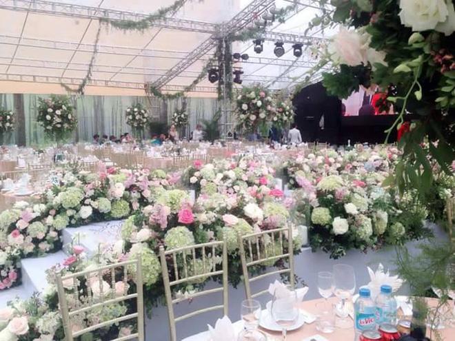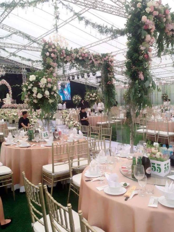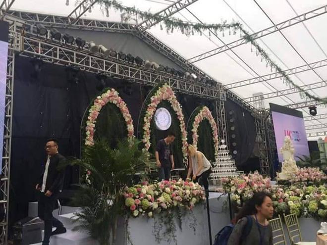 Chú rể Lâm Duy chia sẻ, rạp cưới được xây dựng trên khu đất rộng hơn 1700 mét vuông. Sau khi trải cỏ nhân tạo, tổng diện tích khu đất vào khoảng 2300 mét vuông. Gia đình chú rể phải huy động 3 xe tải 1,4 tấn để chở số hoa tươi nhập khẩu. Ekip trang trí tiệc cưới cũng lên tới 120 người và làm việc liên tục trong gần 1 tuần.