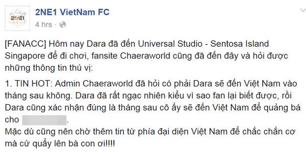 Trước đó vài ngày, YG Family's Lover, fanpage lớn nhất của người hâm mộ YG Entertainment ở Việt Nam đã đăng cover facebook ám chỉ một sự kiện của công ty sắp tới sẽ diễn ra ở Việt Nam. Cùng lúc với 2NE1 VietNam FC, fanpage này cũng đăng tải thông tin Sandara Park đến Việt Nam và tiết lộ thêm điểm đến là Thành phố Hồ Chí Minh.