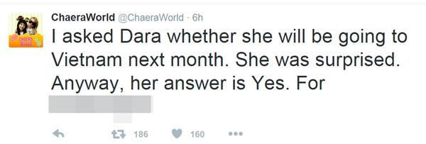 Tuy thông tin đã được chính Sandara Park tiết lộ, nhưng để đảm bảo nữ ca sĩ chắc chắn đến Việt Nam, người hâm mộ đang chờ đón xác nhận từ phía công ty thời trang đối tác mà nữ ca sỹ đang làm đại sứ. Và nếu Sandara Park đến Việt Nam, nhiều người hi vọng lần này sự đón tiếp cô của fan Việt sẽ bình tĩnh hơn, có ý thức hơn, tránh tình trạng đáng tiếc như Seungri (Big Bang) từng tới Hà Nội hồi tháng 4 vừa rồi.