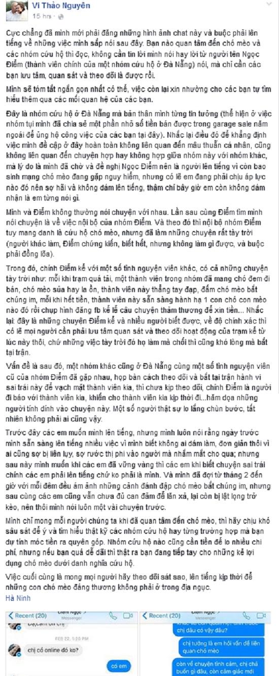 Nguyên văn dòng trạng thái tố cáo hành động vô nhân đạo của Trạm cứu hộ chó mèo ở Đà Nẵng trên facebook của Vi Thảo Nguyên (ảnh chụp màn hình)