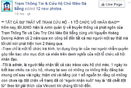 Admin Juno - thành viên hoạt động trong trạm cứu hộ chia sẻ trên fanpage của trạm